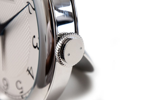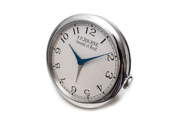 Remarques : Inspiré du  Chronomètre Souverain, cette horloge de bureau / Réveil à quartz réinterprète les codes esthétiques du légendaire horloger indépendant avec un rendu magnifique. Cadran blanc guilloché Clou De Paris, aiguilles en acier bleui emblématiques de Journe avec inscriptions noires et chiffres arabes.
