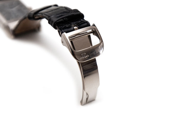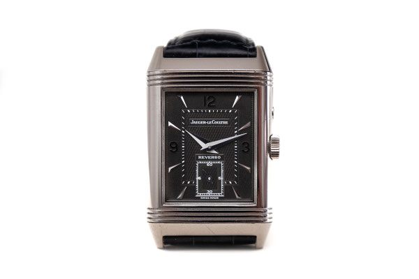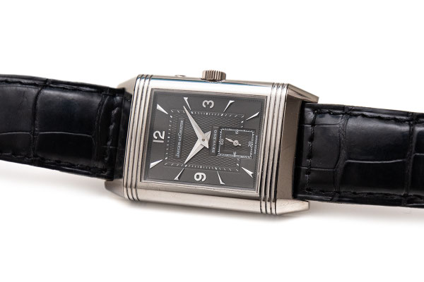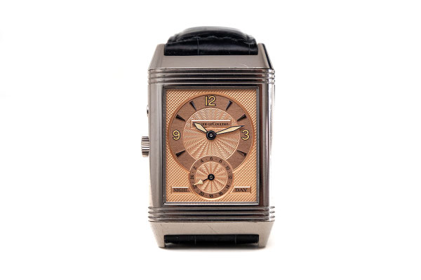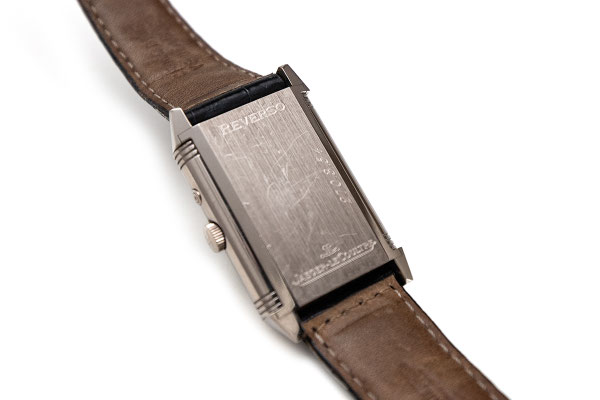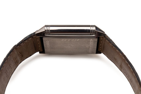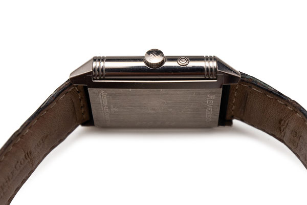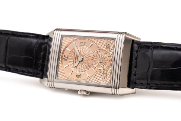 Remarque : Tout l'intérêt de la Reverso dans un boitier précieux et discret en or blanc. En effet, cette pièce propose deux visages différents, l'un est sombre avec une petite seconde rectangulaire et l'autre, saumon avec une petite seconde ronde. Les deux faces proposent en revanche chacune différents guillochages et des index appliqués.