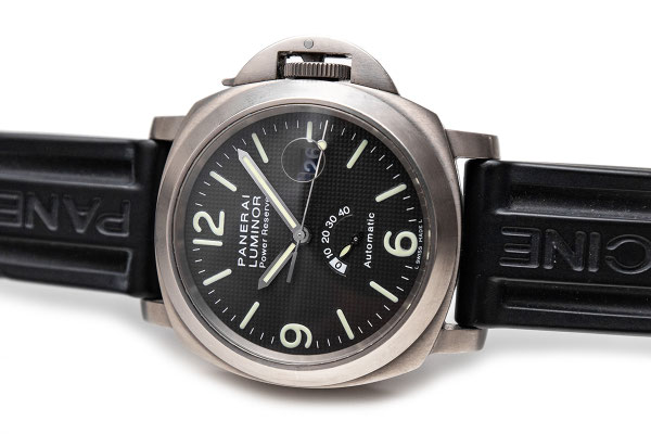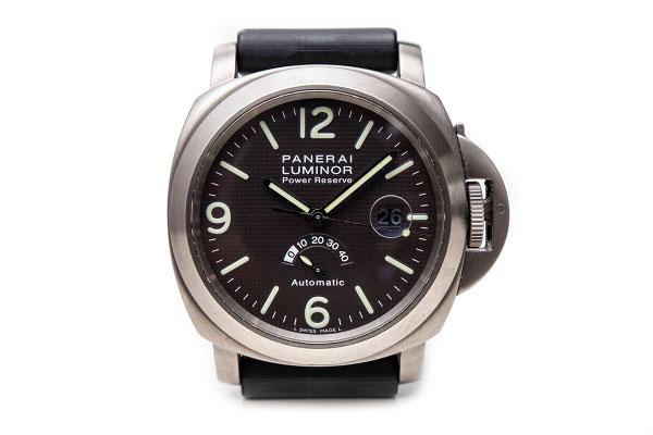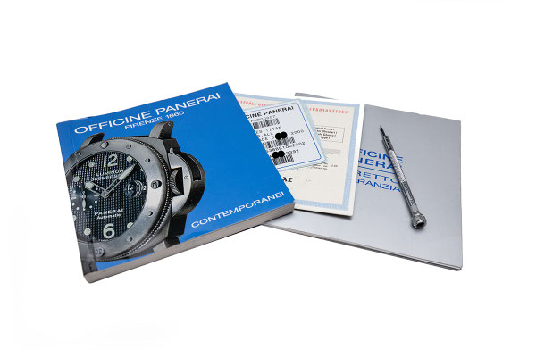 Remarque : Cette Panerai, très peu produite (réellement 500 en 2000 et 50 en 2001) dispose du fameux boitier Bettarini en titane grade 2, d'un cadran marron motif clous de Paris et d'un indicateur de réserve de marche à 6h. L'ensemble est animé par un calibre ETA 2892-A2 avec un module Soprod 9040 pour la réserve de marche. Montre vendue avec manuel, livret de garantie, certificat COSC et étiquette.