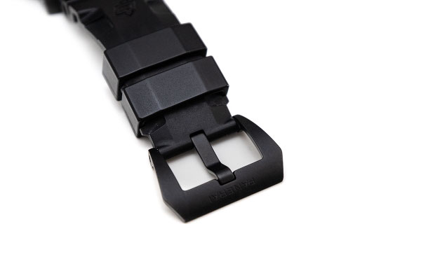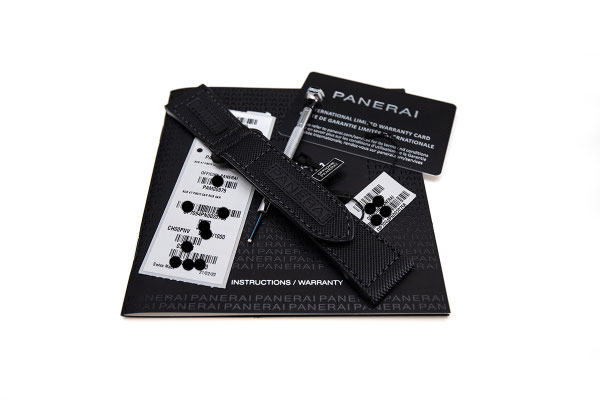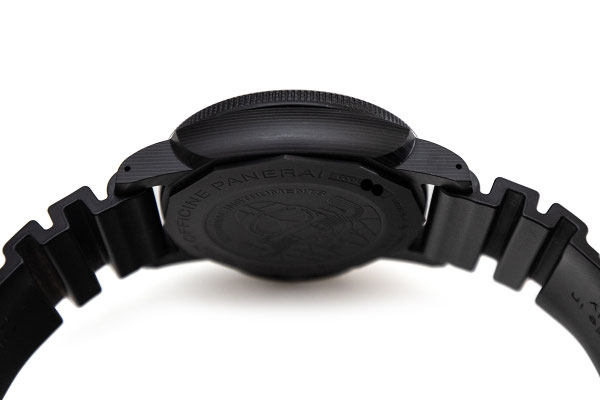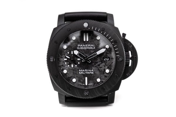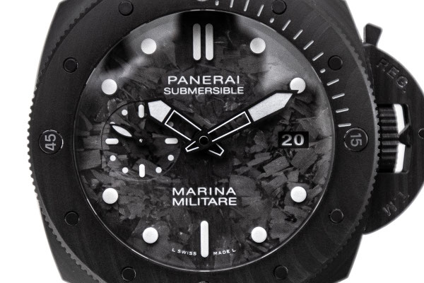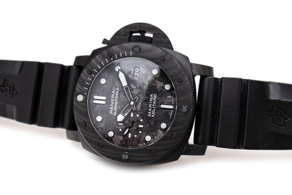 Remarque : Pour cette très belle pièce, c'est la carbone qui est massivement employé. Le boitier ainsi que le pont de protection de la couronne sont en carbotech alors que le cadran est lui en carbon forgé permettant de beaux jeux de lumières. Sur le dit cadran, 2 mots magiques pour les amateurs de la maison italienne : "Marina Militare". Une dénomination mythique, historique et rare sur les Panerai.