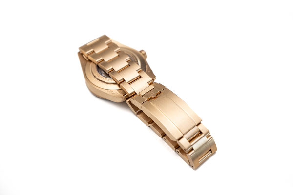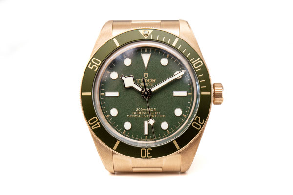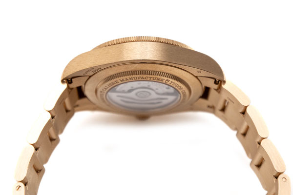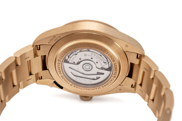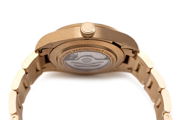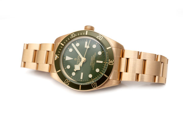 Remarque : Tudor poursuit son développement et monte en gamme avec l'apparition de modèle avec des métaux précieux. Ici, c'est l'or jaune qui est employé aussi bien pour le boitier que pour le bracelet. Le tout est discrètement rehaussé par le cadran et l'insert de lunette vert. Bien entendu, c'est un calibre auto maison qui anime cette Tudor.