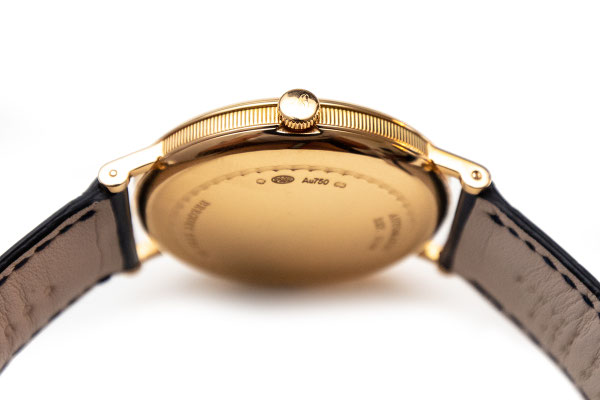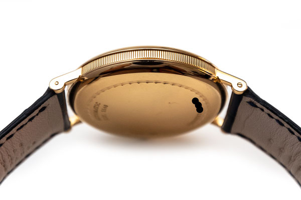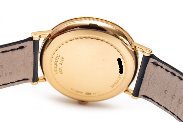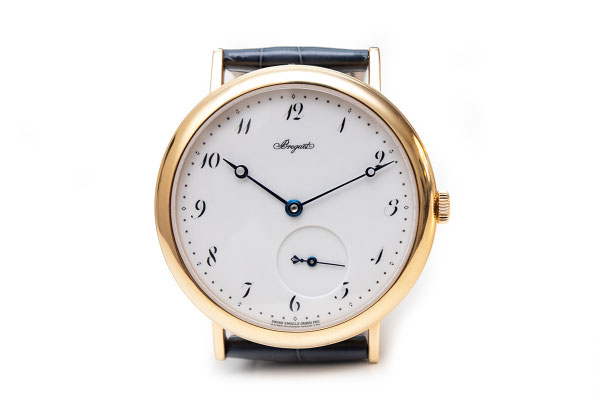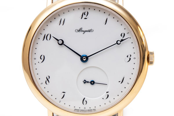 Remarques : Expression classique et intemporelle de la montre bracelet 3 aiguilles Breguet. Boitier avec carrures canellées, aiguilles Breguet bleuies, ici une petite seconde déportée et surtout un superbe cadran réalisé en émail Grand Feu d'un blanc immaculé. Très belle pièce alliant classicisme et modernité, son calibre étant à remontage automatique et disposant d'un Spiral et d'une ancre en silicium.