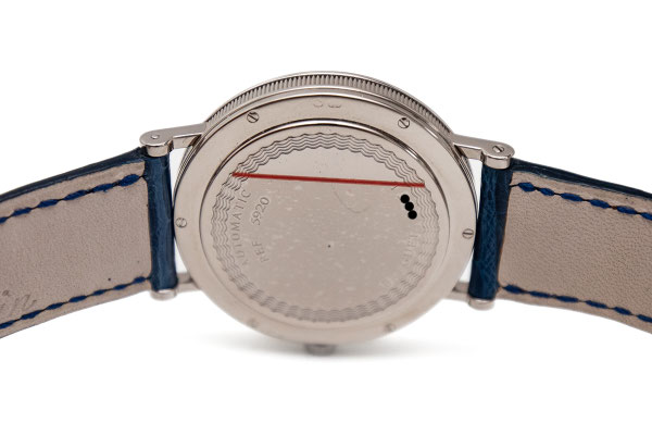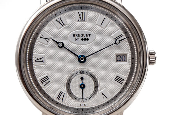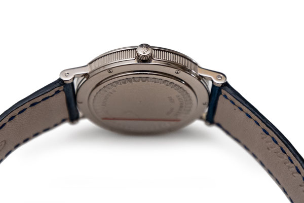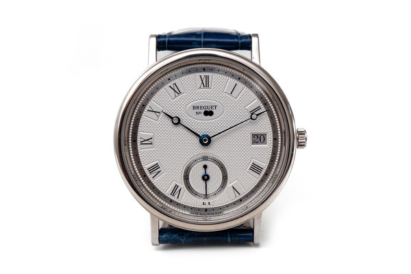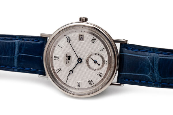 Remarques : Très belle Breguet emprunte d'un classicisme intemporel mais aussi d'une certaine modernité à travers son guichet dateur et la petite seconde située à 6h. Le cadran dispose d'un beau guillochage fait à la main et se voit animé par des aiguilles Breguet bleuies fines et élégantes. Le mouvement automatique extra plat, permet d'obtenir une pièce de seulement 7.5mm.