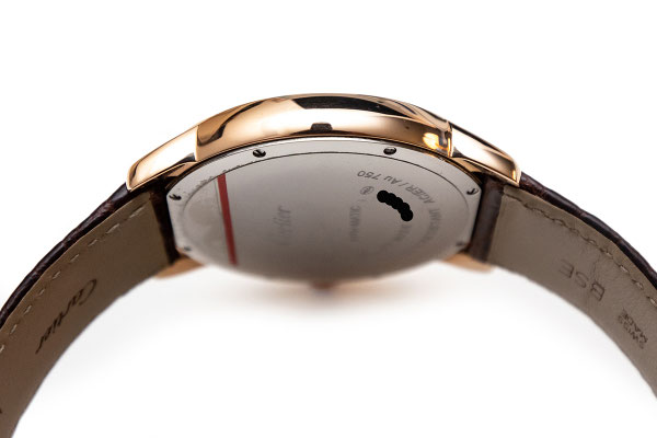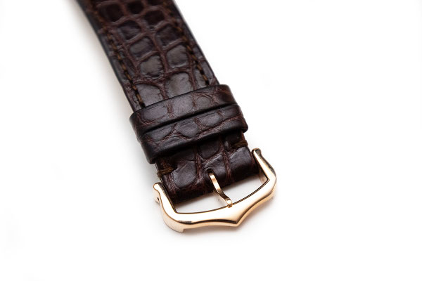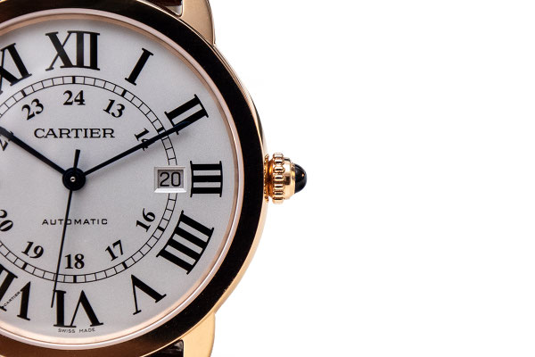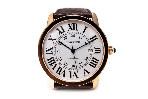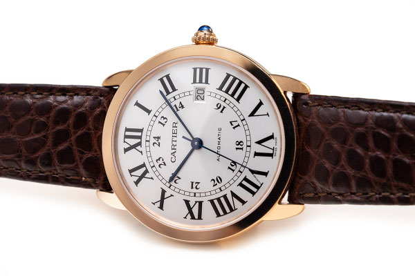 Remarques : Très belle Cartier Ronde Solo avec cadran opalin avec chiffres romains et arabes en son centre, signature secrète et guichet de quantième à 3h. Aiguilles bleuies de forme glaive. Boitier en or, fond vissé en acier. Mouvement à remontage automatique animé par le calibre 049.