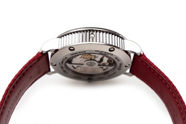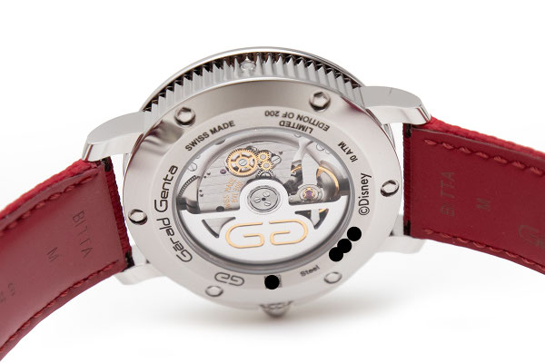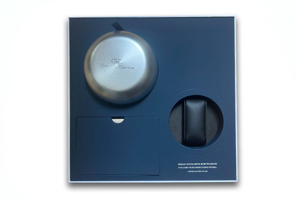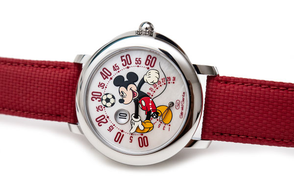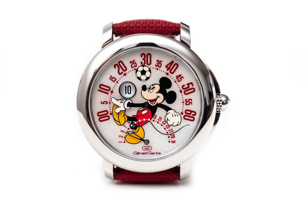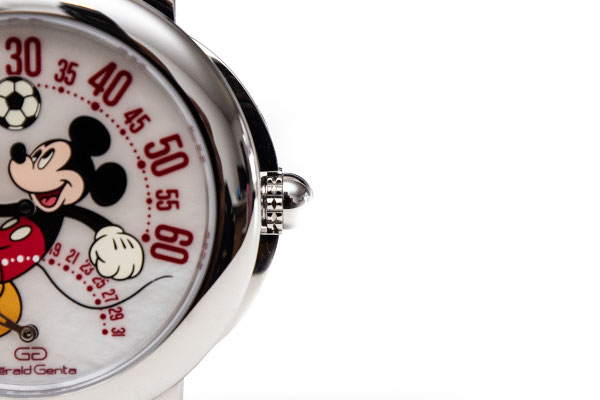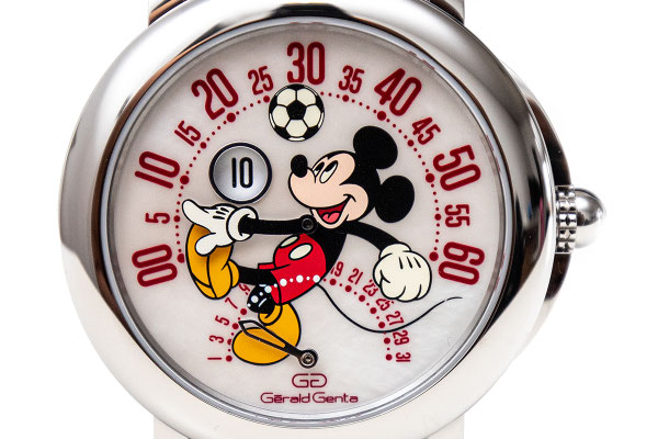 Remarque : Editée à seulement 200 exemplaires, cette nouvelle création Genta sous l'ère Bulgari reprend le boitier Arena reconnaissable à ses joues de carrure et cannelures. Le superbe cadran en nacre présente Mickey jouant au foot, son bras droit annonçant les minutes de manière rétrograde (tout comme la date) alors qu'un guichet permet de voir les heures sautantes. Montre neuve, jamais portée, complète.