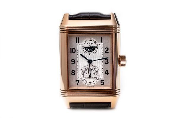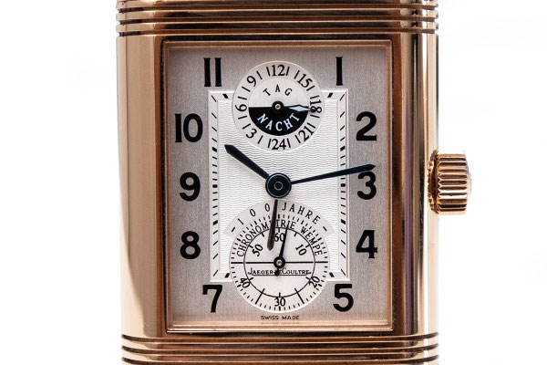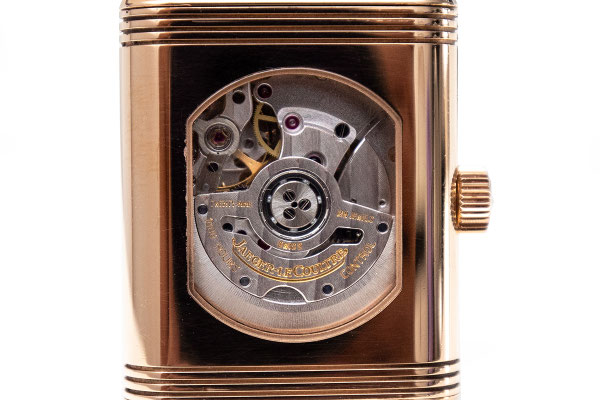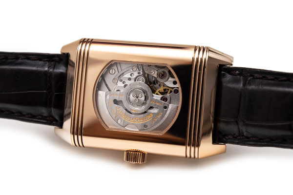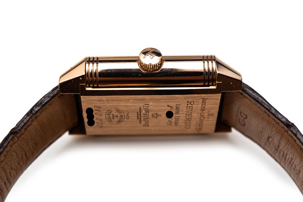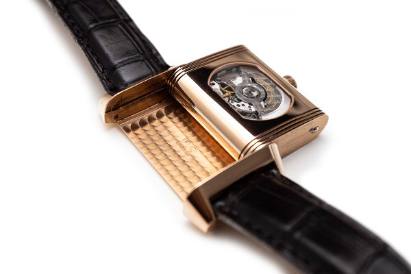 Remarque : Editée à seulement 25 exemplaires, cette Reverso en or rose a été produite pour fêter les 100 ans du distributeur Wempe. Cette pièce se distingue de par sa fonctionnalité GMT accompagnée d'une indication Jour / Nuit située à 12h. La petite seconde à 6h permet d'animer se cadran guilloché. L'ensemble est entrainé par un calibre à remontage automatique que l'on peut observer sur l'autre face de la montre.