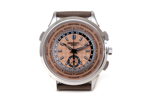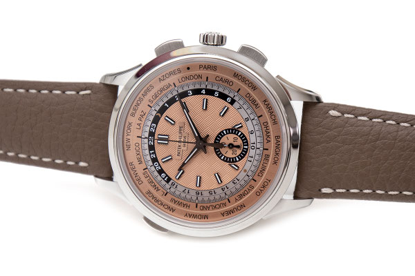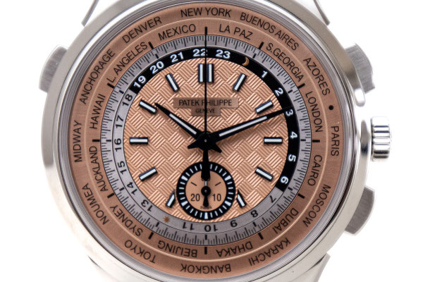 Remarque : Toute première version en acier d’un modèle-culte, le nouveau chronographe automatique flyback à Heure Universelle référence 5935A se distingue par son style sportif et vintage. Le cadran saumon présente un centre avec motif « carbone » ajoutant une touche moderne et dynamique. L’Heure Universelle indique simultanément l’heure dans 24 fuseaux horaires.