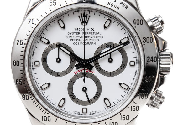 Remarque : Inutile de présenter en détail le mythique chronographe Daytona. Ici, décliné en acier sur cadran blanc, cette pièce emblématique se fait discrètement précieuse. La lunette graduée vient encercler une magnifique cadran rehaussé des sous compteurs cerclés. Définitivement sportive et culte, notre exemplaire est en superbe état et dispose d'un full set.