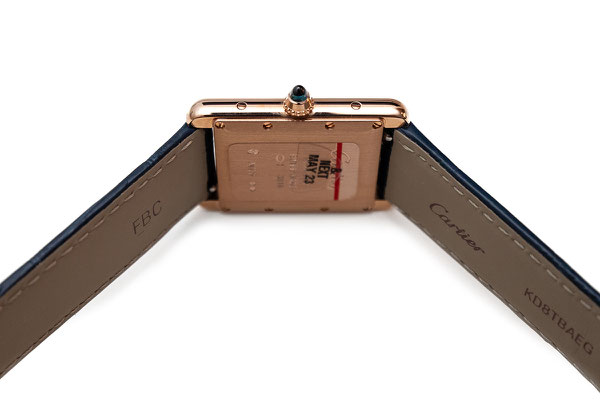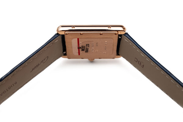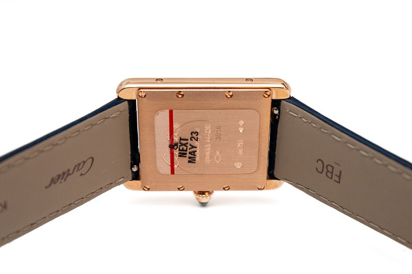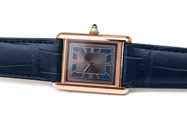 Remarques : La Tank, c’est l’élégance, un trait sans concession. Avec elle, lors de sa création en 1917, Louis Cartier fait le choix esthétique du rectangle à l’opposé des montres rondes de sa génération. Les 2 brancards parallèles sont sa signature, inspirée du dessin d’un char militaire vu de haut : les brancards pour les chenilles, le boîtier pour l’habitacle du véhicule.