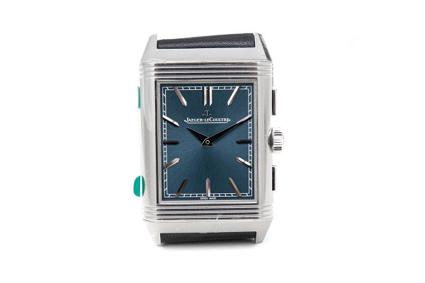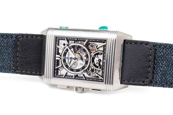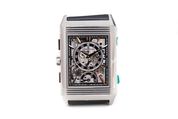 Remarque : Équipée du superbe nouveau Calibre Manufacture 860, la Reverso Tribute Chronograph réussit un double défi : celui d’afficher l’heure sur ses deux faces, mais aussi un chronographe entièrement squelette et laissant admirer la roue à colonne ainsi qu'un compteur totalisateur rétrograde. Du très bel ouvrage. Montre jamais portée.